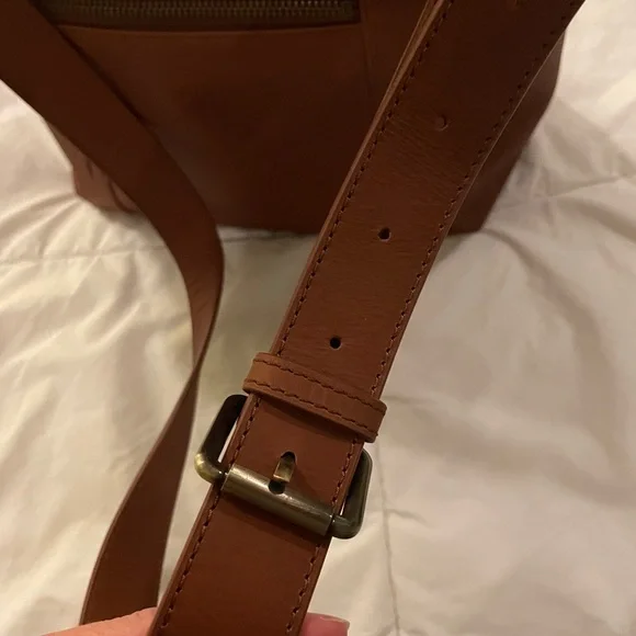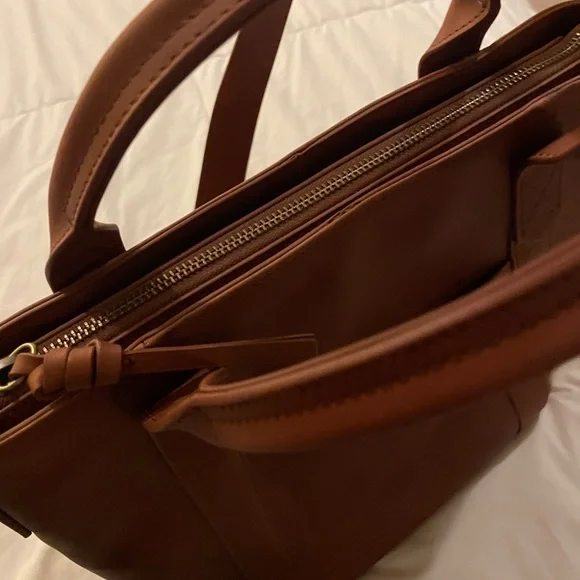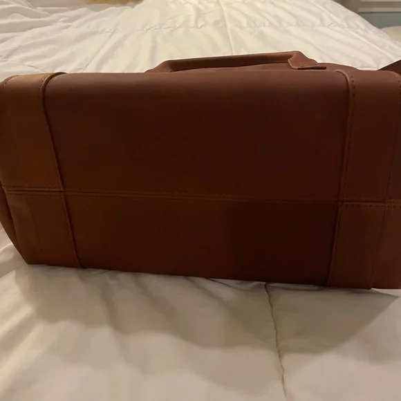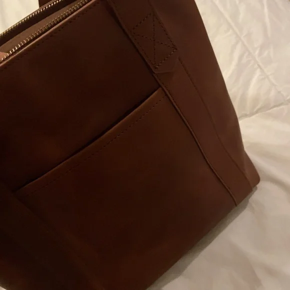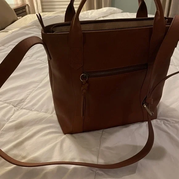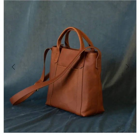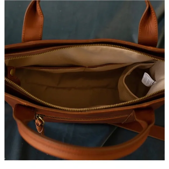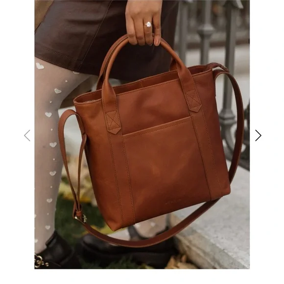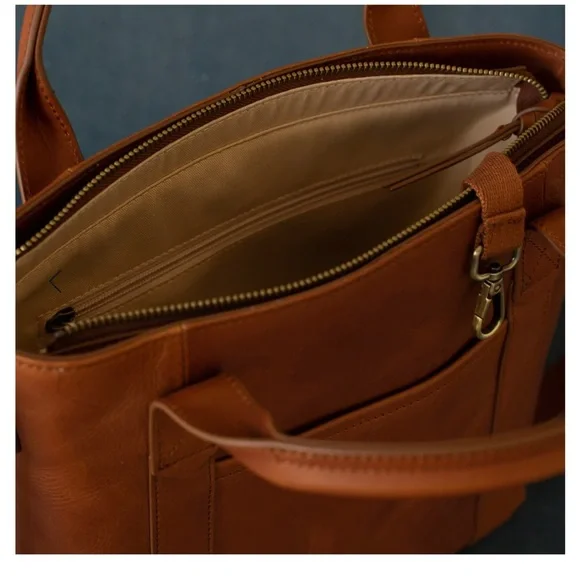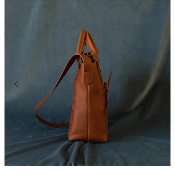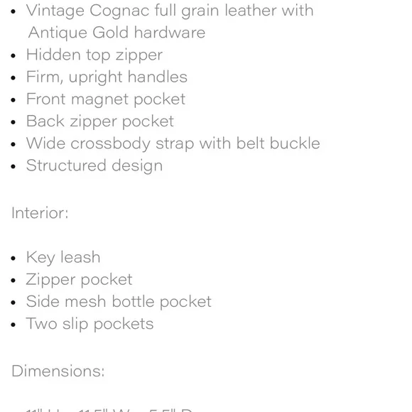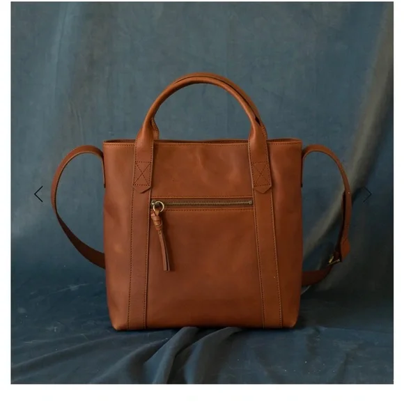 NWOT. Never used. Flawless condition. Very functional with interior pockets and key leash. Two exterior pockets - one zippered and one with magnetic closure. Grab handles as well as attached crossbody strap.Vintage Cognac full grain leather with antique gold hardware. Fantastic medium sized tote!Dimensions:11" H x 11.5" W x 5.5" DHandle drop: 17 - 25"11.5 LI always ship within 24 hours of purchase 📦